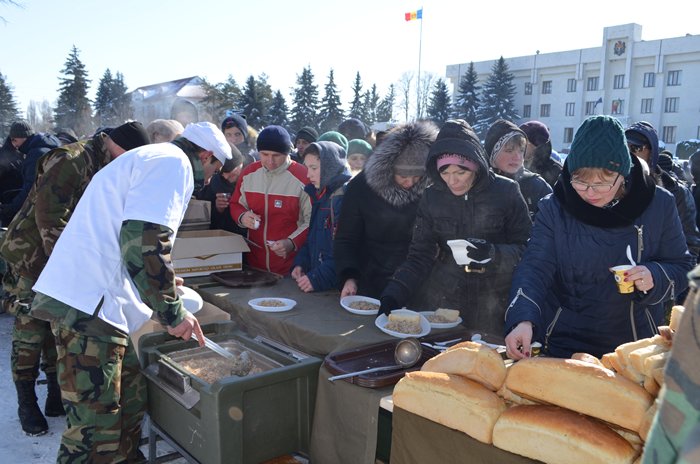 În final, toți participanții, arși de razele soarelui cu dinți, s-au încălzit cu ceai, vin fiert și terci ostășesc, preparate și puse în masă de bucătari-soldați la o ospătărie ostășească mobilă.