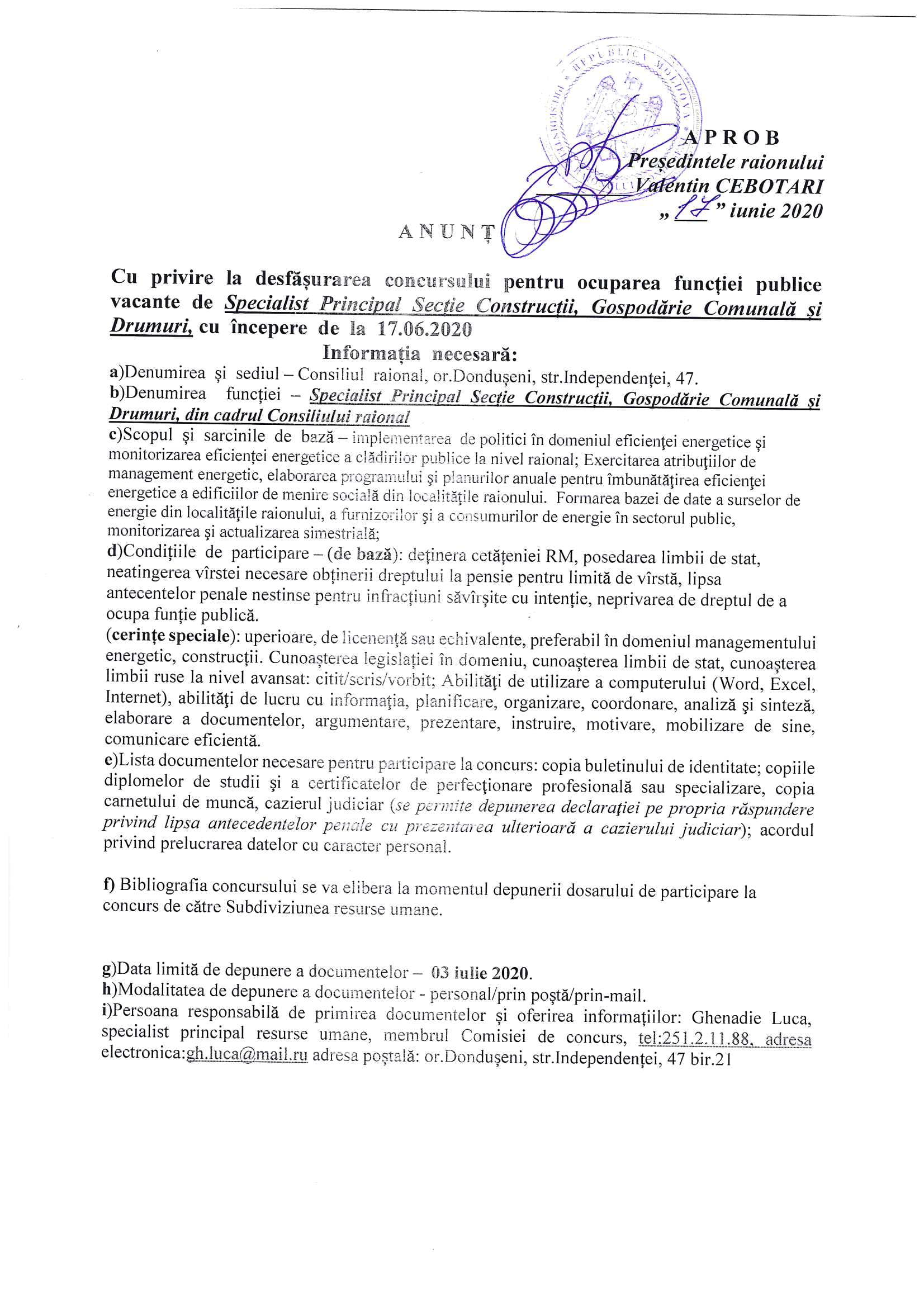 Anunț Cu privire la desfășurarea concursului pentru ocuparea funcției publice vacante de Specialist Principal Secție Construcții, Gospodărie Comunală și Drumuri