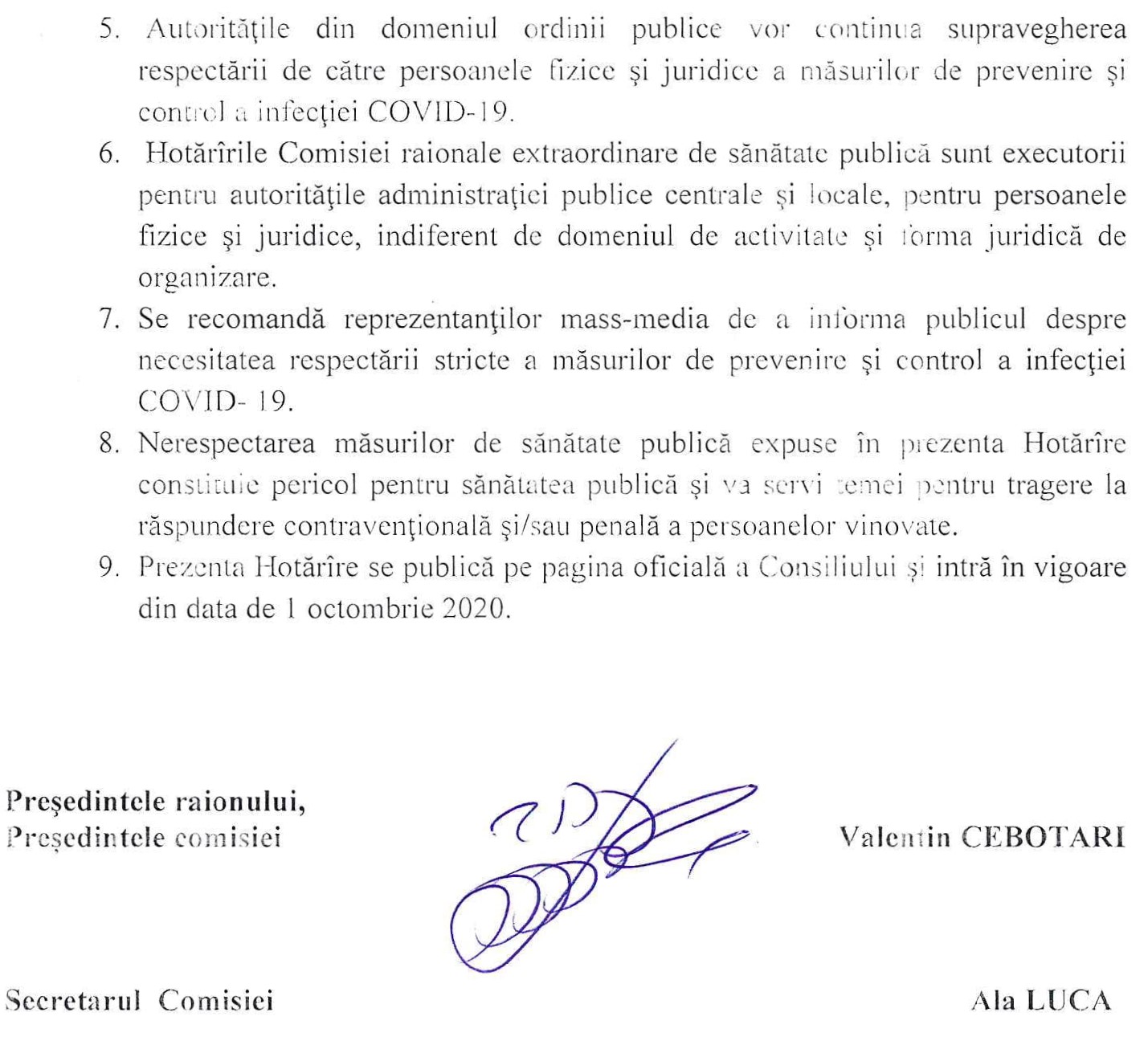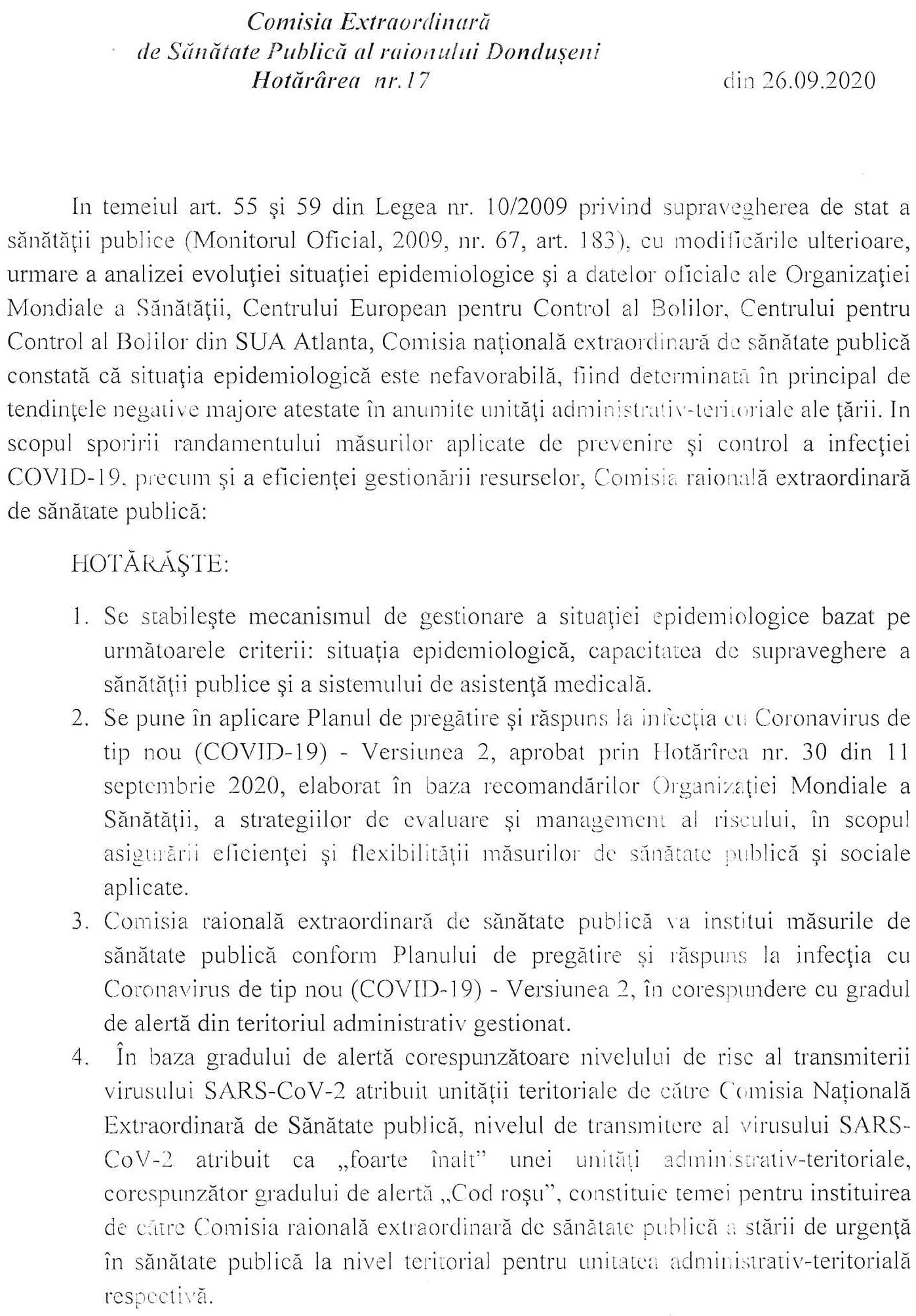 Comisia Extraordinară de Sănătate Publică al raionului Dondușeni Hotărârea nr.17 din 26.09.2020