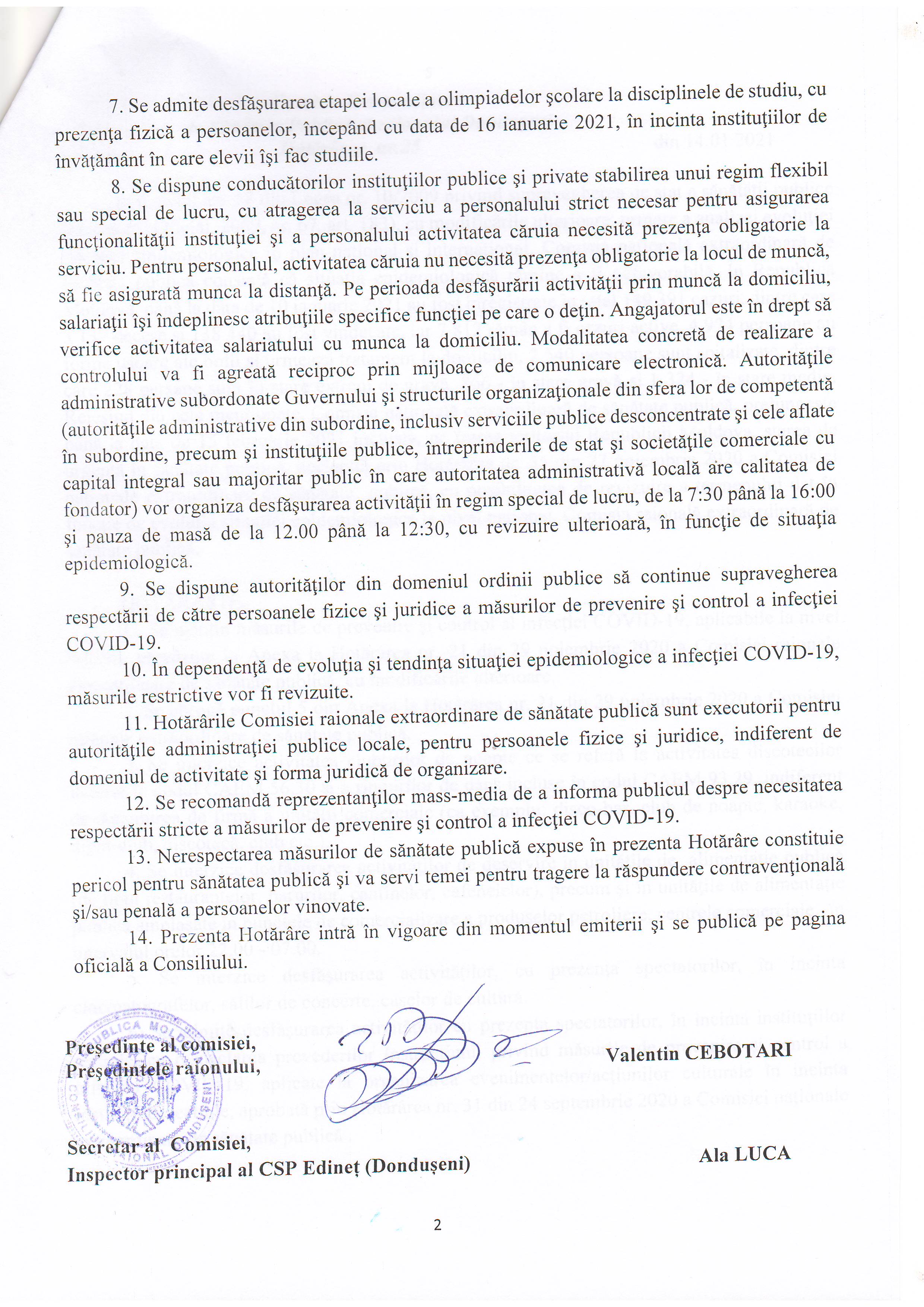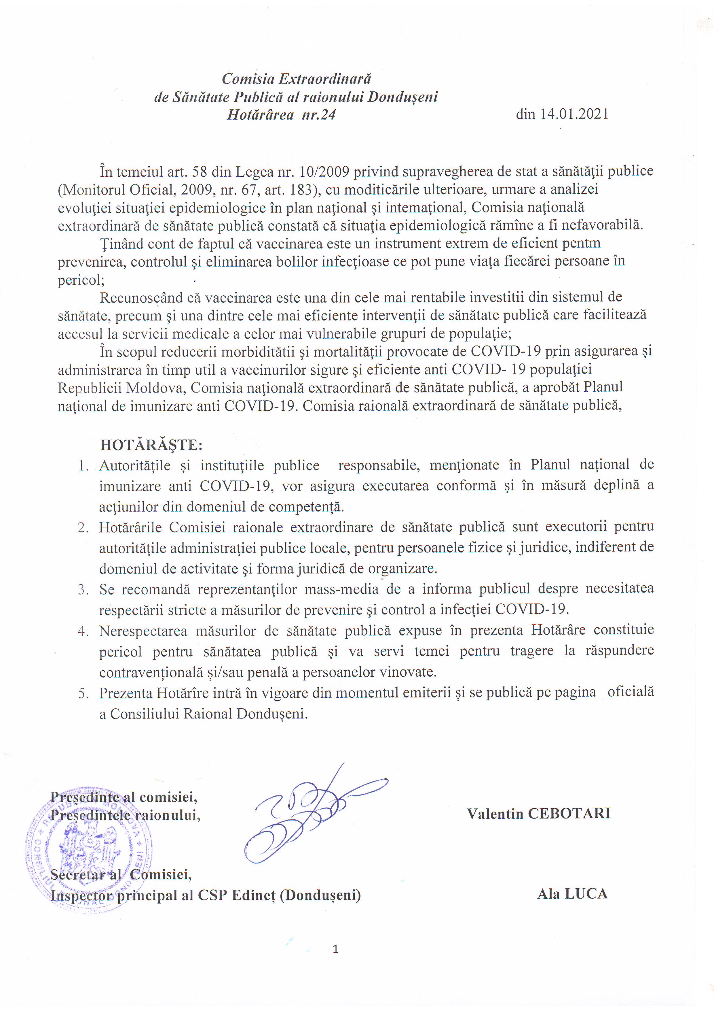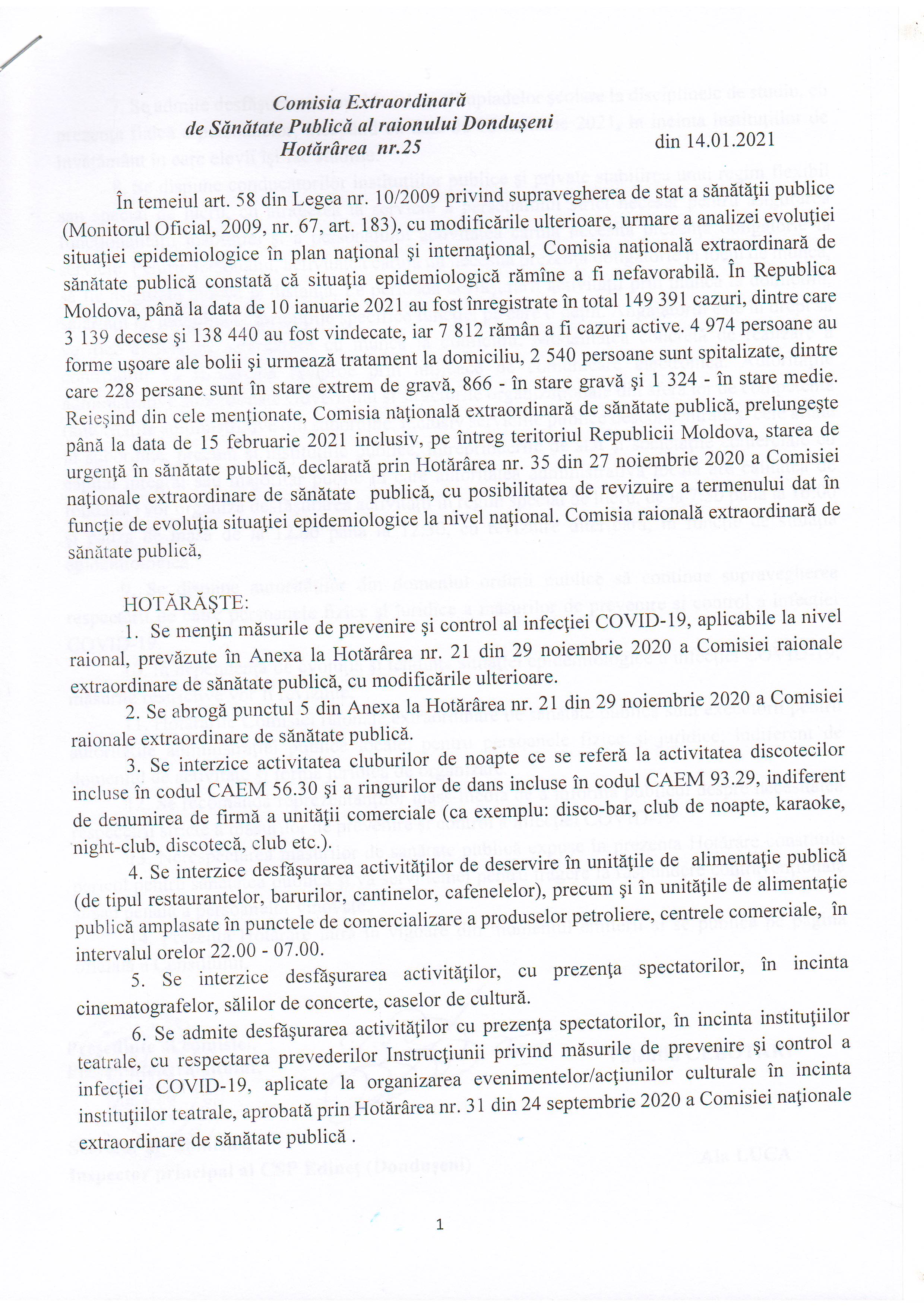 Comisia Extraordinară de Sănătate Publică al raionului Dondușeni Hotărârea nr.24-25 din 14.01.2021