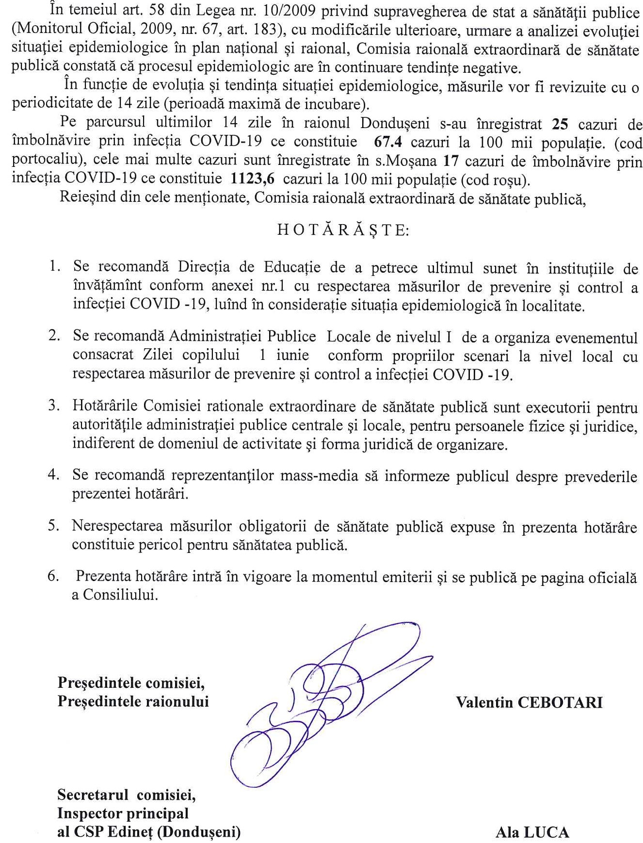 Comisia Extraordinară de Sănătate Publică al raionului Dondușeni nr.38 din 26.05.2021