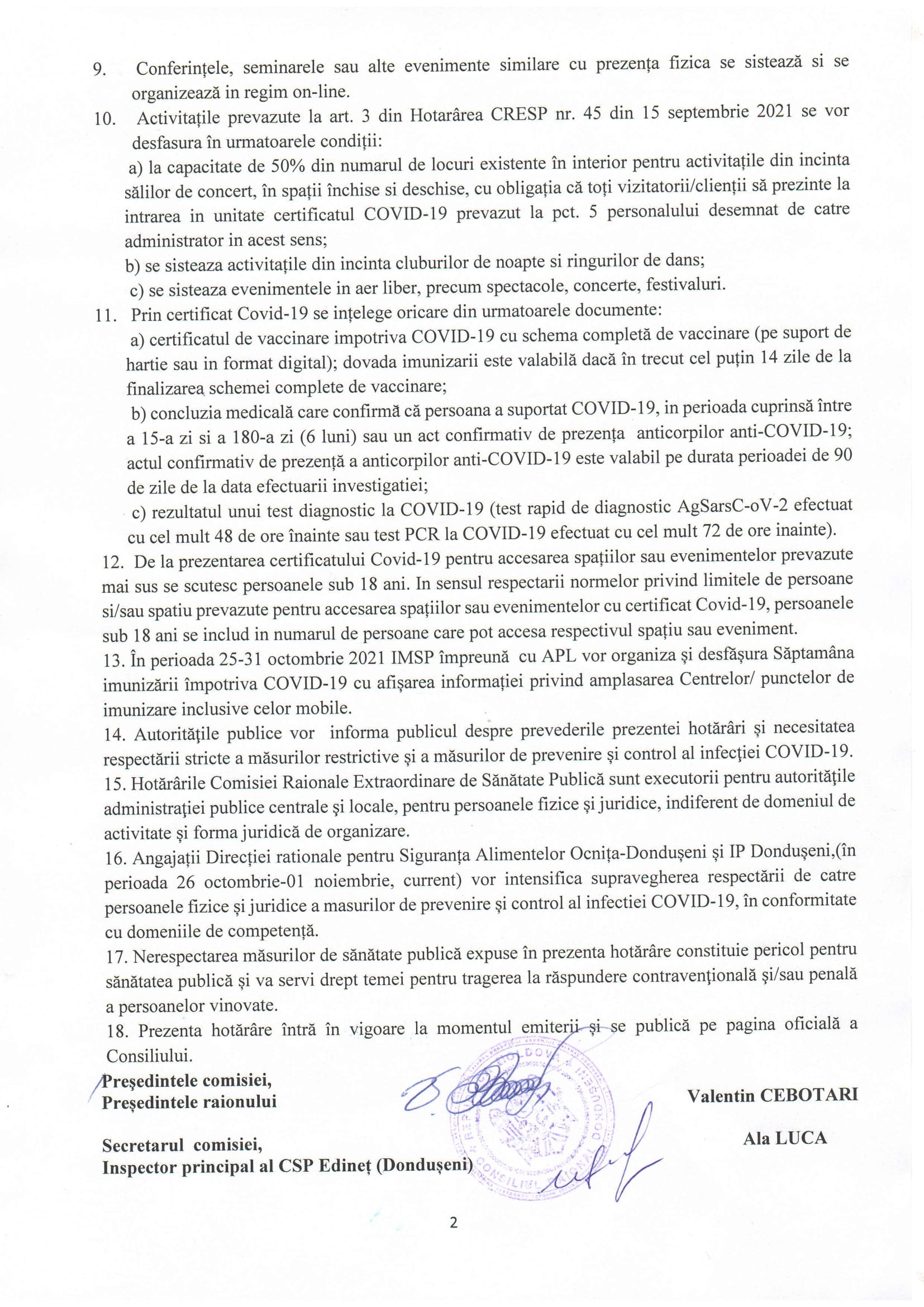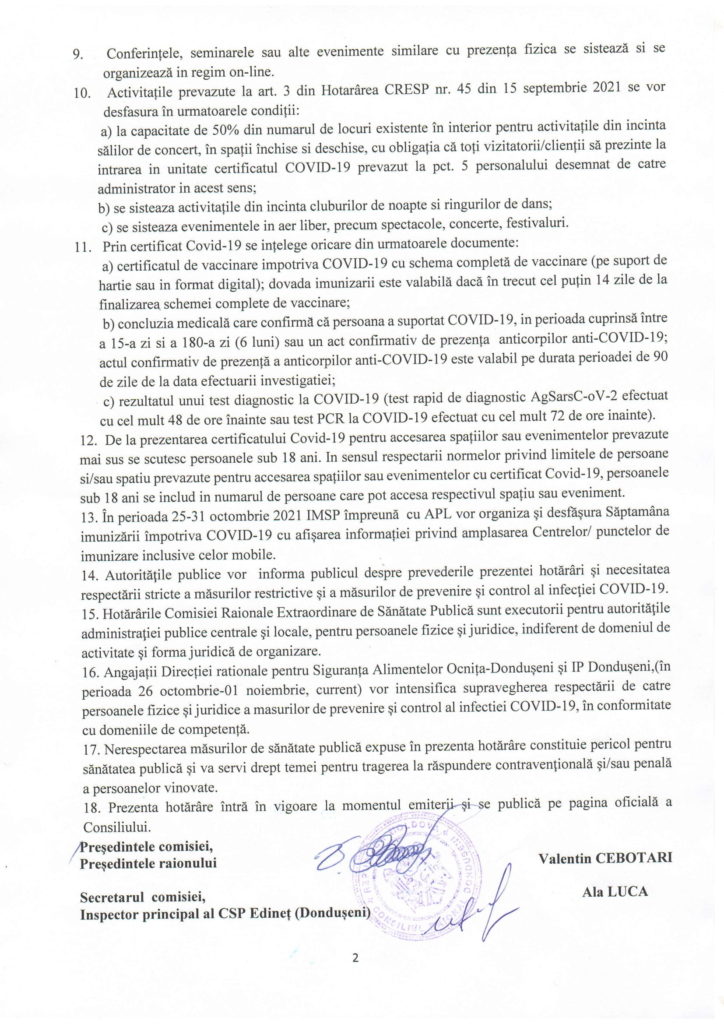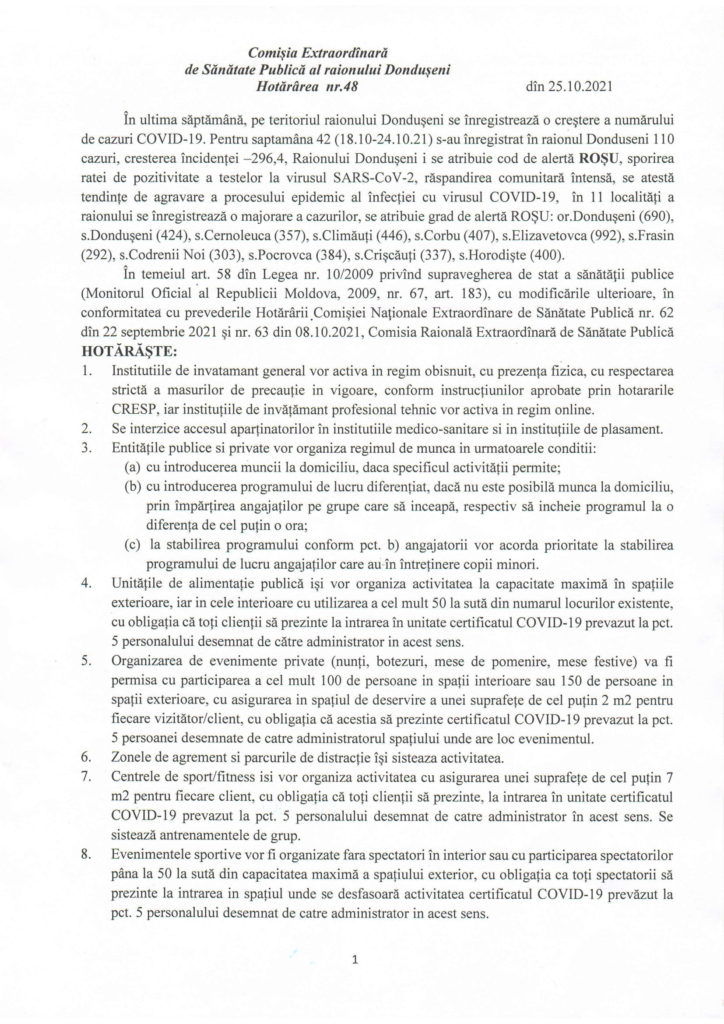 Comisia Extraordinară de Sănătate Publică al raionului Dondușeni Hotărârea nr.48 din 25.10.2021