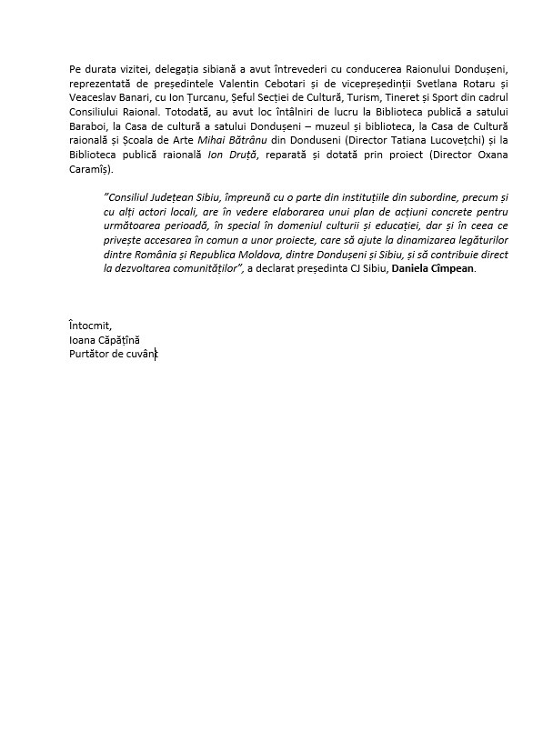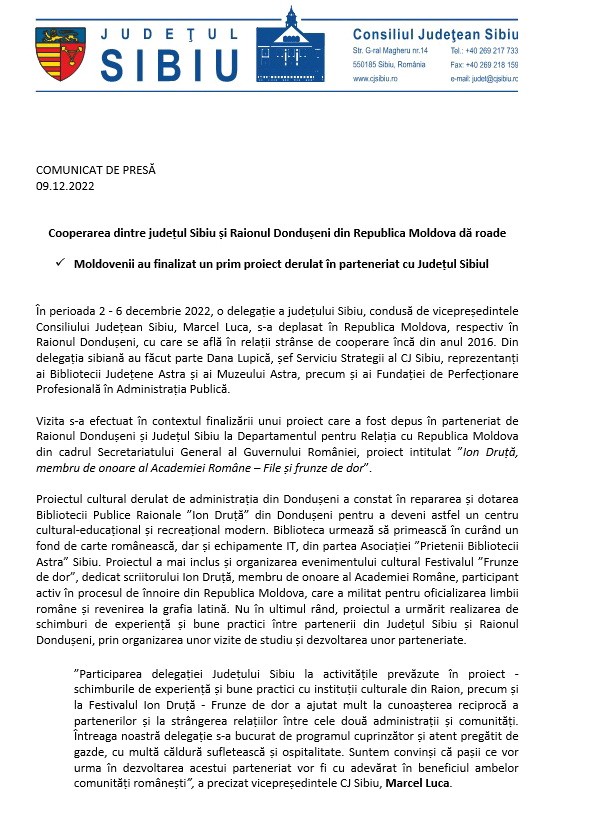Cooperarea dintre județul Sibiu și Raionul Dondușeni din Republica Moldova dă roade