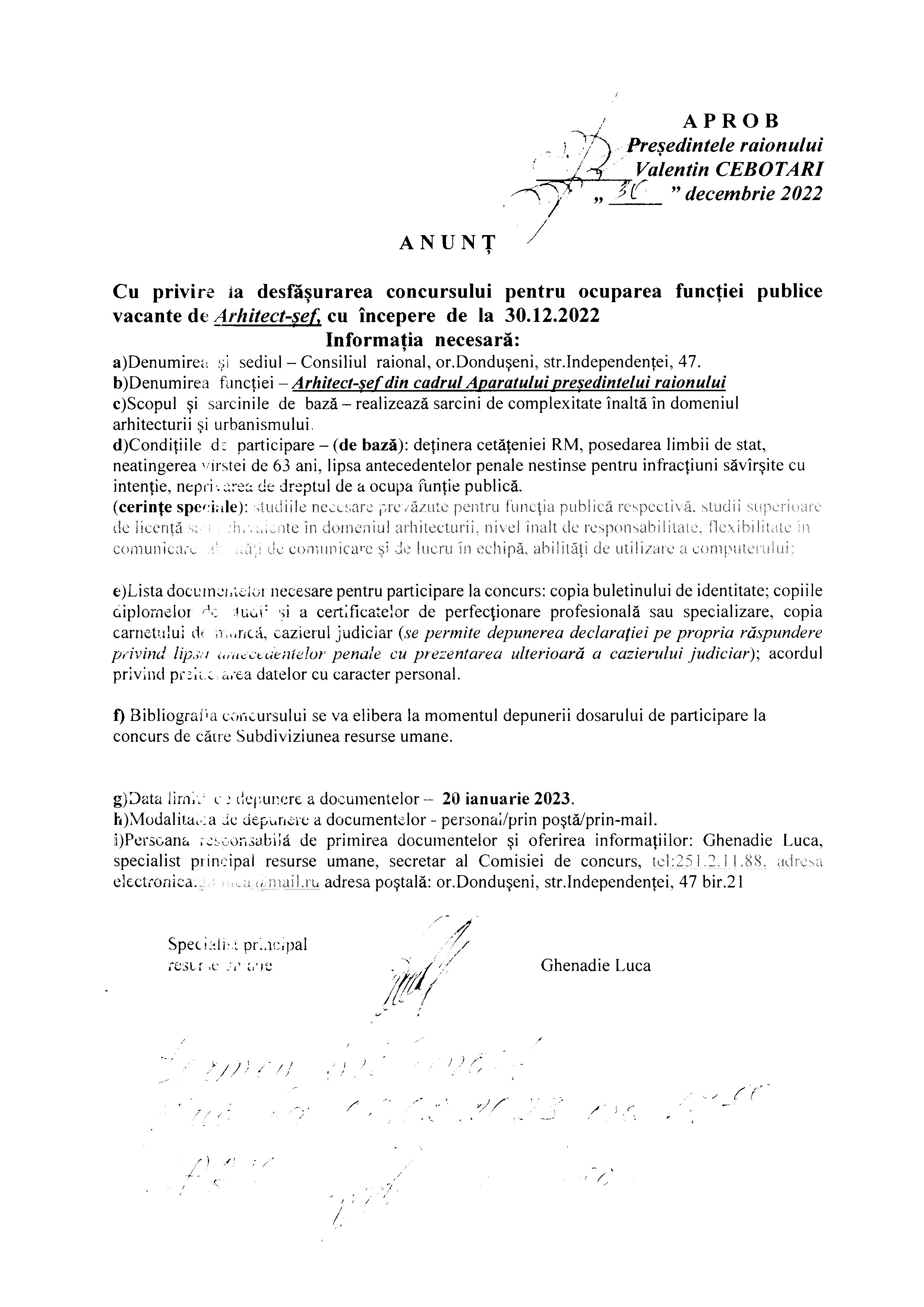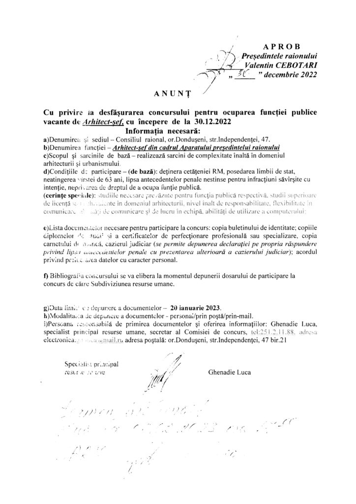 Anunț cu privire la desfășurarea concursului pentru ocuparea funcției publice vacante de Arhitect-șef