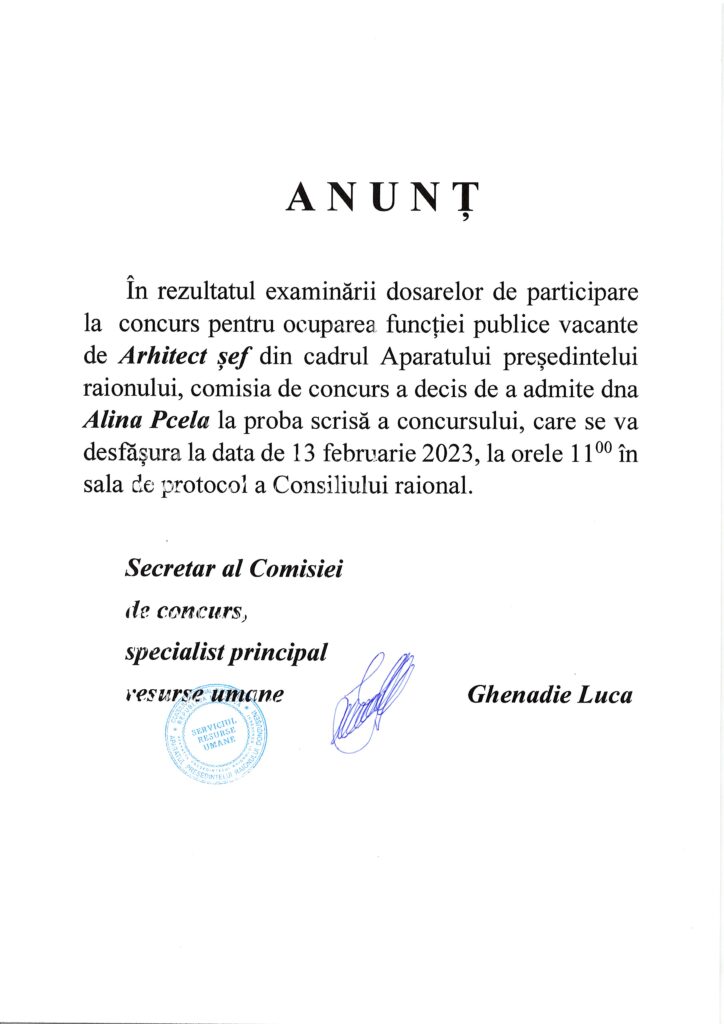 Rezultatele concursului pentru ocuparea funcției publice vacante de Arhitect-Șef
