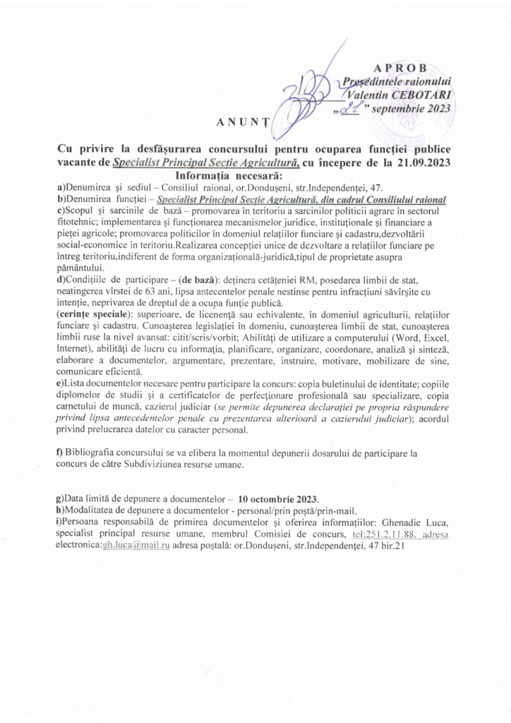 Anunț la concursul pentru funcția vacantă de specialist principal secția agricultura