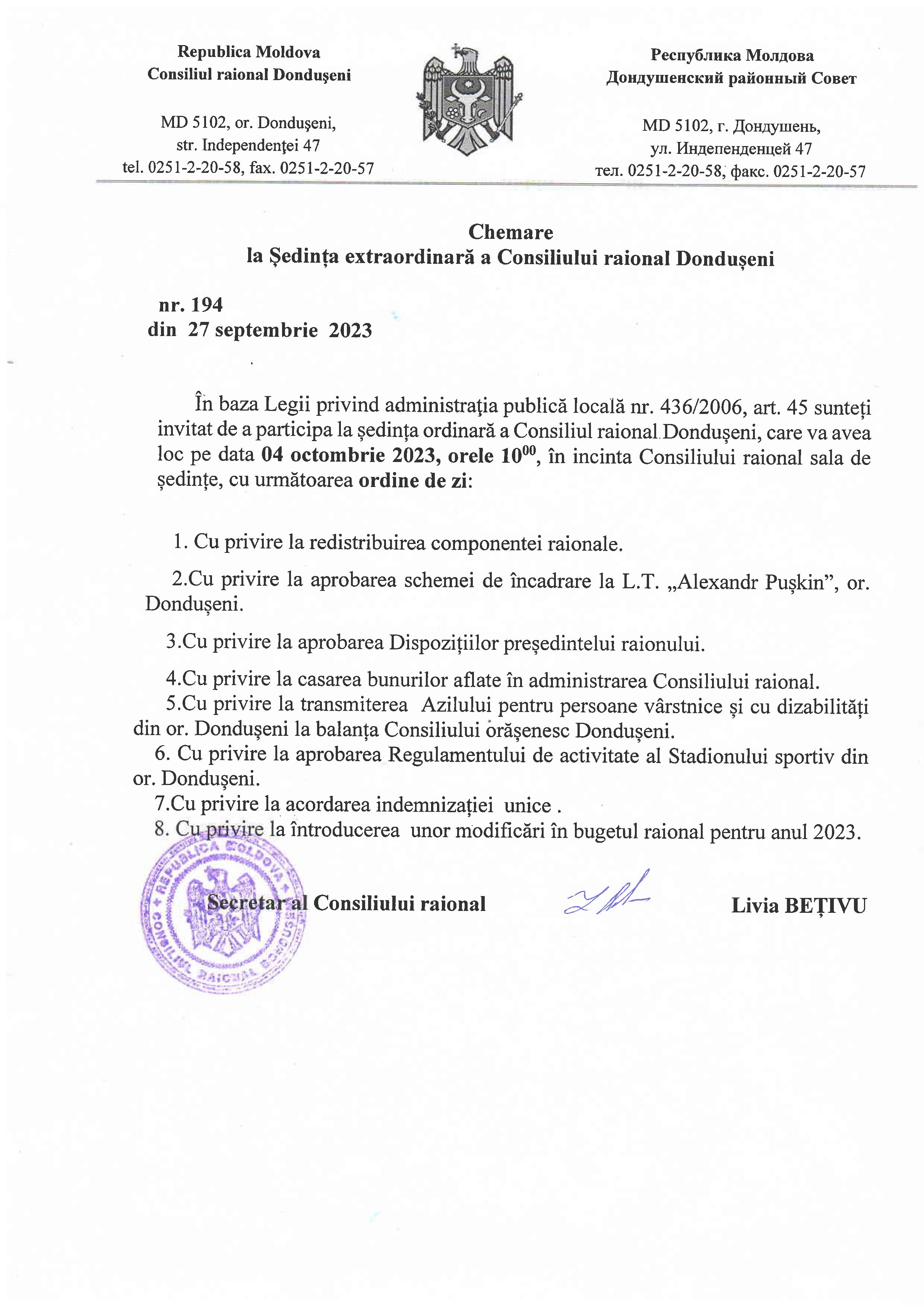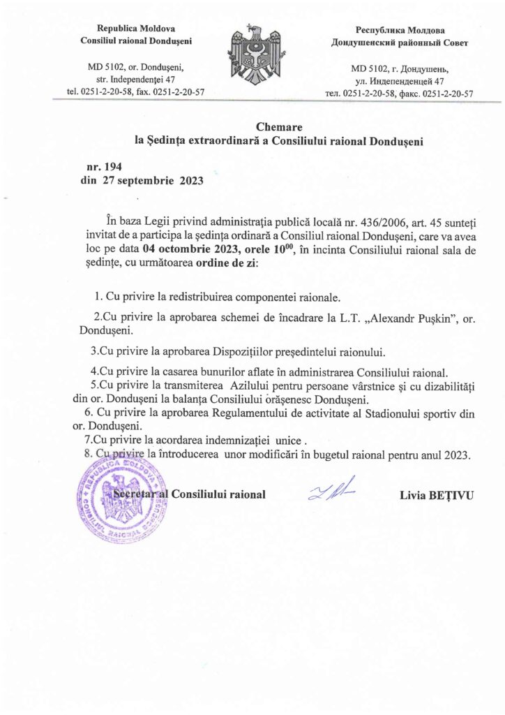 Chemare la Ședința extraordinară a Consiliului Raional Dondușeni