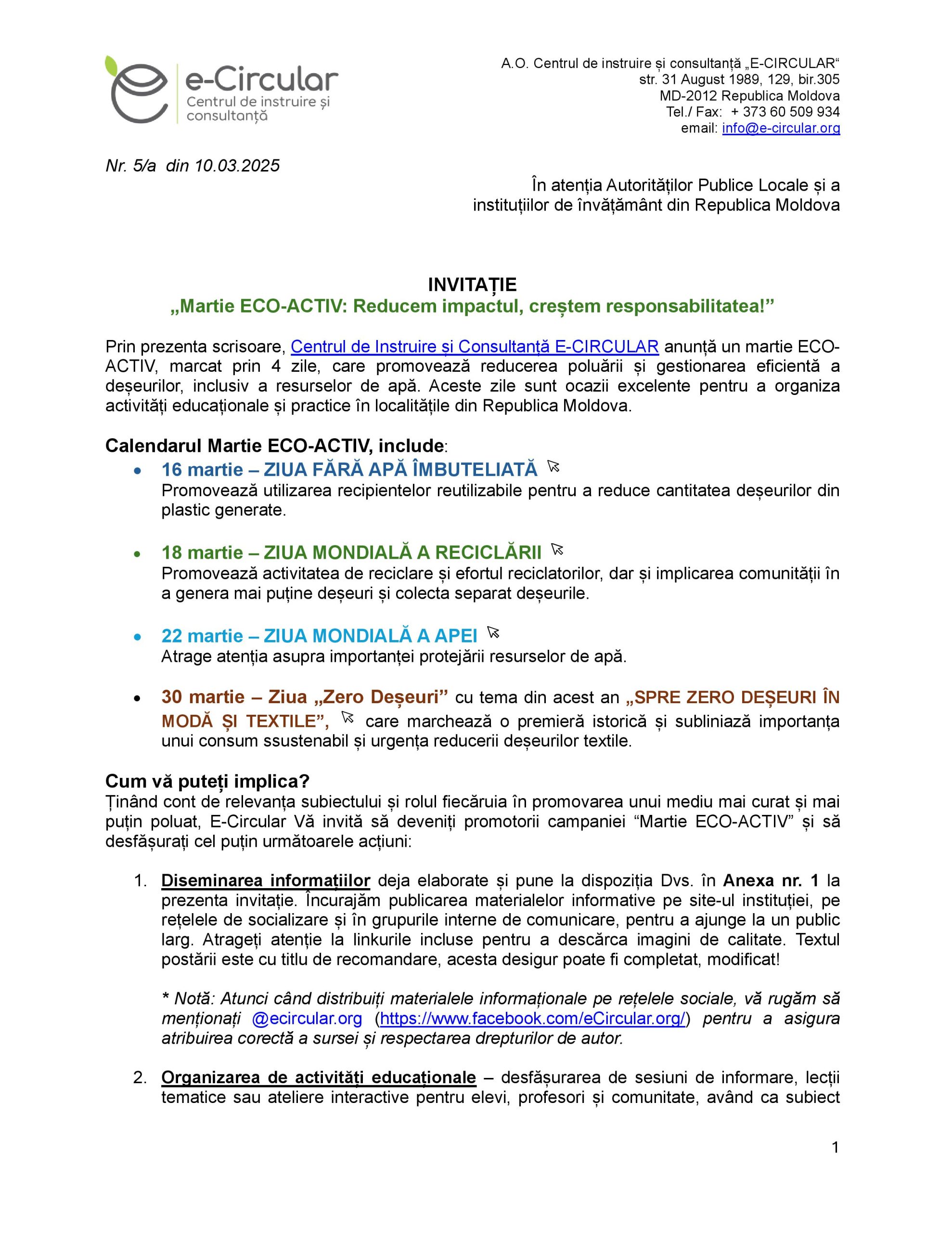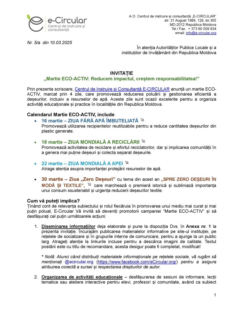 INVITAȚIE „Martie ECO-ACTIV: Reducem impactul, creștem responsabilitatea!”