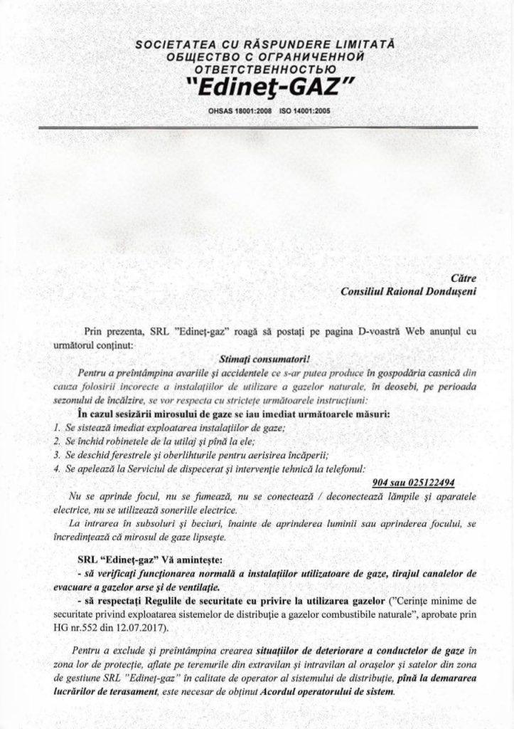 SRL ”Edineț-Gaz” vă informează!